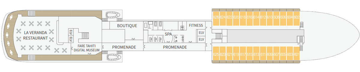 南太平洋の海を巡る為にデザインされたエレガントなラグジュアリー船です。喫水が浅いためにラグーンの中や島々に接近することが可能で長い上陸時間を確保しています。165の船室は全てアウトサイドに面し、お部屋から南太平洋の美しい景観をご堪能いただけます。船内は木材を多用しポリネシアの文化に敬意を表しています。2021年にはフランス人デザイナーの元、大改装を施し、より洗練されたくつろぎの空間が広がっています。