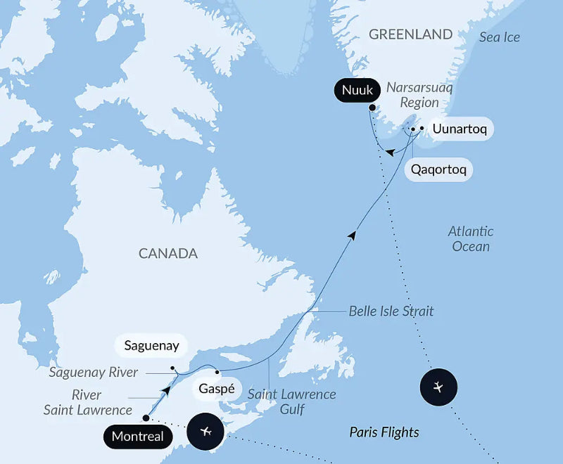 ・セントローレンス海路とグリーンランド南西海岸を極地探検船ル コマンダン シャルコーに乗船し、探検します。