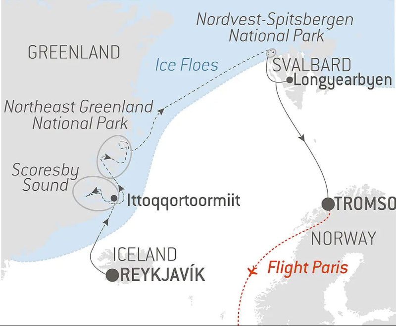・極地探検船、ル コマンダン シャルコーに乗船し、秋の北東グリーンランド国立公園と北西スピッツベルゲン国立公園を探検しましょう。 ・流氷、氷山、氷床、氷河などの景観と、ホッキョクグマ、ジャコウウシ、ホッキョクギツネ、スヴァールバル諸島のトナカイなどの野生動物を観察・観察する機会があります。 ・アクティビティ:カヤック、ハイキング、 スノーシュー、極地ダイビング、イヌイットとの交流、オーロラ鑑賞など。