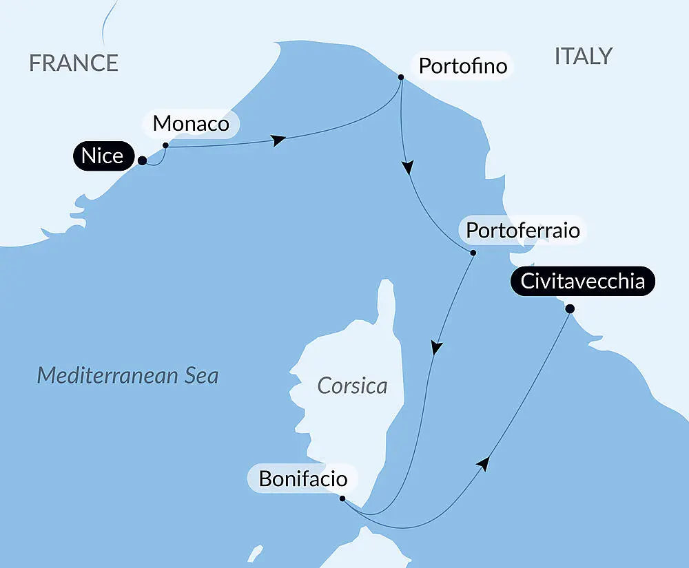・地中海の真珠のような島々:象徴的な都市(ポルトフィーノ、モナコ)、豊かな歴史(エルバ島)、そしてコルシカ島の自然の宝石(ボニファシオ)。